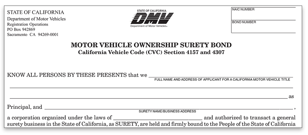 The DMV requires a Motor Vehicle Ownership Surety Bond (Reg 5057) when you cannot prove ownership and one of the following conditions exist: